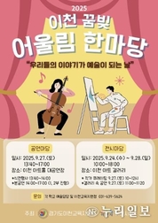 (누리일보) 경기도이천교육지원청과 이천시가 공동으로 주최하고, 경기도이천교육지원청이 주관하는 '2025 이천 꿈빚 어울림 한마당'이 오는 9월 이천 아트홀과 이천 아트 갤러리에서 개최된다. 이번 행사는 학생 및 교원, 학부모 등 관내 모든 시민이 함께 참여해 문화예술의 향기를 나누는 자리로 마련됐다. 공연마당은 9월 27일 오후 1시 40분부터 이천 아트홀 대공연장에서 열린다. 식전행사(13:40~14:00)를 시작으로 오후 2시부터 5시까지 1·2부로 본 공연을 진행해, 다양한 무대가 관객을 맞이할 예정이다. 전시마당은 9월 24일부터 9월 28일까지 이천 아트 갤러리에서 매일 오전 10시부터 오후 6시까지 운영된다. 특히 27일에는 오전 10시부터 12시까지 ‘작가 큐레이팅’이 진행되며, 오전 11시에는 ‘갤러리 속 공연’이 열려 관람객들에게 특별한 경험을 선사한다. 경기도이천교육지원청 김은정 교육장은 “이번 어울림 한마당은 학생과 지역사회가 함께 만들어가는 문화예술 축제”라며, “지역민 모두가 예술을 통해 소통하고 공감하는 뜻깊은 시간이 되기를 기대한다”고 말했다.