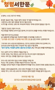 (누리일보) 경기도수원교육지원청은 9월 신학기를 맞아 관내 모든 학교에 청렴서한문을 배포하고, 교육가족 모두가 함께하는 청렴 실천을 당부했다. 이번 서한문은 “‘청렴’은 단순한 규범이 아니라 학교 현장을 지탱하는 보이지 않는 힘이자, 우리 모두의 신뢰를 이어주는 투명한 약속”임을 강조하며, 교직원들이 일상 속 작은 실천을 통해 청렴한 조직문화를 함께 만들어 갈 것을 요청하는 내용을 담고 있다. 수원교육지원청은 이러한 메시지를 실천으로 확산하기 위해 조직문화 개선 활동도 병행하고 있다. 경기도교육청이 추진하는 '신규임용·승진·발령 시 답례품 제공 관행 근절' 과제에 적극 동참하고자 내부 직원을 대상으로 조직문화 개선 설문조사를 실시했으며, 그 결과 “경조사 참여는 자유롭게, 답례는 선물 대신 인사말로”라는 자체 실천 과제를 마련했다. 김선경 교육장은 “이러한 과제는 학교 현장과 교육가족 모두가 함께할 때 비로소 의미 있는 변화를 이끌어낼 수 있다”며, “작은 실천이 쌓여 공정하고 투명한 학교 문화를 정착시키고, 학생들이 정직과 책임의 가치를 내면화하여 미래를 이끄는 인재로 성장하길 바란다”고 말했다.
