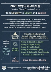 (누리일보) 경기도교육청국제교육원(원장 조영민)이 30일 국내외 학생을 대상으로 ‘2025 학생국제교육포럼’을 개최했다. 이번 포럼은 지난해에 이어 두 번째로 열린 행사로 UN 지속가능발전목표(SDGs) 중 ‘인류 보편적 문제’를 주제로 학생들이 협력적 탐구와 토의를 통해 미래세대의 세계시민 역량을 기르도록 기획됐다. 올해 포럼은 ‘평등을 넘어, 형평성과 정의로(From Equality to Equity and Justice)’를 대주제로 교육·디지털·건강·경제·문화와 인종 형평성 등 5개 소주제에 대해 직접 문제를 분석하며 협력적 해결의 가능성을 탐색했다. 영어로 진행된 이번 포럼은 실시간 쌍방향 원격프로그램으로 운영됐으며 경기도 내 고등학생 35명과 일본·필리핀·인도네시아 등 해외 학생 18명이 동시에 참여했다. 참가 학생들은 ▲사전 실행학습을 통한 주제 관련 연구 ▲Neal Dreamson 교수(뉴욕주립대학교 한국, SUNY Korea)의 기조 강연 ▲경기도교육청국제교육원 원어민 강사진의 패널 토의 ▲모둠별 토의와 발표 자료 제작 ▲결과 발표 및 공유 등을 통해 세계시민 의식을 기르는 기회를