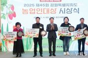 (누리일보) 강원특별자치도는 강원일보사와 공동으로 11월 4일 오전 11시, 춘천 세종호텔에서 '2025 제45회 강원특별자치도 농업인대상 시상식'을 개최했다. 이날 행사에는 여중협 행정부지사, 박진오 강원일보사장, 김용복 강원특별자치도의회 부의장을 비롯해 도의원, 농업인대상 수상자와 가족, 농협중앙회 강원지역본부장, 도 농업인단체 총연합회장 및 회원 단체장 등 150여 명이 참석했다. 올해로 45회를 맞은 강원특별자치도 농업인대상은 1981년부터 강원특별자치도와 강원일보사가 공동 주최해온 강원 농업 분야의 최고 권위 있는 상으로, 매년 도내 우수 농업인과 농업단체를 선정해 시상하고 있으며, 2024년까지 총 300명이 수상의 영예를 안았다. 이번 시상식에서는 농업·농촌 발전에 기여한 5개 부문 수상자 5명에게 상패가 수여됐다. 부문별 수상자는 △친환경농업부문 영농조합법인 강원유기농, △수출유통부문 농업회사법인 솜씨가㈜, △축산발전부문 김진선, △미래농업육성부문 추경진, △농촌융복합산업부문 해담마을 영농조합법인이다. 아울러 농촌마을활력프로젝트 우수마을로 선정된 4개 마을에 대한 시상식도