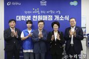 (누리일보) 3일 문을 연 가천대학교 천원매점 일일 점원에 나선 김동연 경기도지사가 대학생들과 매점 음식을 나누며 기후위기 등 다양한 주제를 가지고 소통했다. 경기도는 고물가로 늘어난 대학생 생활비 부담을 실질적으로 낮추기 위해 전국 최초로 ‘대학생 천원매점’을 성남 가천대와 평택대학교에 3일 개소했다. 가천대 개소식에는 김동연 지사를 비롯해 이길여 가천대 총장, 김성록 NH농협은행 경기본부장, 김민성 가천대학교 학생대표 등이 참석했다. 대학생 천원매점은 NH농협은행 경기본부의 기부금을 재원으로, 학생 자치 기구가 직접 운영하며 경기도가 행정적 지원을 하는 가게로 청년층 지원을 위한 새로운 민·관·학 협력 모델로 주목을 받고 있다. 천원매점에서는 학생들의 선호도 조사를 거쳐 선정된 즉석밥, 참치캔, 컵라면 등 먹거리와 샴푸, 클렌징폼 등 생필품 30여 종을 취급한다. 재학생 인증 후 물품 4개를 ‘꾸러미’로 1천 원에 구매할 수 있으며, 시중가 대비 90% 이상 저렴해 월말·학기초 학생들의 생활비 절감 효과가 클 것으로 기대된다. 김동연 지사는 이날 점원용 조끼를 입고 일일 천원매점 점