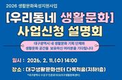 (누리일보) 대구문화예술진흥원은 2월 13일부터 3월 6일까지 2026 생활문화육성지원사업 '우리동네 생활문화'에 참여할 생활문화 공간 및 연계 기획단체를 공개 모집한다. ‘우리동네 생활문화’는 지역 내 새로운 생활문화 공간을 발굴하고, 생활문화 기획 프로그램 운영을 통해 커뮤니티 기반 생활문화 공간 조성을 지원하는 사업이다. 올해는 대구 전 지역을 대상으로 신규 생활문화 공간 발굴과 함께 생활문화 활동이 부족한 권역(계층·지역)의 활성화 및 지속 가능한 공동체 육성에 중점을 두고 운영된다. 공모 대상은 대구에 소재한 생활문화 활동이 가능한 공간과 생활문화 기획 역량을 갖춘 단체(문화콘텐츠 관련 예술가·기획자·활동가 등으로 구성된 단체)가 연계된 단체가 대상이다. 올해는 총 10개 내외의 단체를 선정할 예정이며 선정된 단체에는 단체당 550만 원의 사업비 지원과 함께 ‘우리동네 생활문화 지도’ 플랫폼 내 통합 홍보 등을 지원할 예정이다. 공모에 앞서 2월 11일 14시, 대구생활문화센터에서 사업설명회가 진행되며, 사업 신청은 2월 13일부터 3월 6일까지 국가문화예술지원시스템을 통해