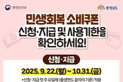 (누리일보) 2차 민생회복 소비쿠폰의 신청 기한이 오는 31일 마감되는 가운데, 충남도가 도내 미신청자에 대해 기한 내 신청·사용할 것을 당부했다. 신청 마감일은 31일 오후 6시로, 기한 내 신청해야 10만 원을 지원받을 수 있다. 민생회복 소비쿠폰은 지역경제에 신속히 활력을 불어넣기 위해 사용기한이 명확히 설정돼 있다. 사용기한은 이미 지급된 1차분과 2차분 모두 다음달 30일까지다. 온오프라인으로 받은 카드 포인트는 기한 내 사용해야 하며, 기한이 지나면 잔액은 자동 소멸한다. 종이형 상품권도 기한이 지나면 사용이 불가하다. 소비쿠폰 통계 시스템 자료에 의하면 도내 1차 온라인 지급분 기준 3280억 원 중 2.5%인 83억여 원이 아직 사용되지 않은 것으로 나타났다. 도의 2차 소비쿠폰 지급률은 24일 기준 96%로, 지급 대상자 중 7만여 명의 도민이 아직 받지 않은 것으로 집계됐다. 도 관계자는 “민생회복 소비쿠폰은 국민의 가계 부담을 덜고 지역경제를 회복하기 위한 실질적 민생 지원 정책”이라며 “신청 마감일은 10월 31일, 사용기한은