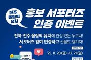 (누리일보) 전북특별자치도는 전주 하계올림픽 유치를 향한 국민적 관심과 응원을 모으기 위해 다음 달 21일까지 '전주 올림픽 유치 홍보 서포터즈 인증 이벤트'를 진행한다고 1일 밝혔다. 도는 국민과 함께 만들어가는 전주 올림픽 유치를 목표로 지난 8월부터 홍보 서포터즈를 모집·운영 중이다. 약 1,900명이 참여하고 있는 서포터즈는 개인 SNS 등 온라인 채널을 통해 전주 올림픽 유치 소식을 자유롭게 공유하며, 올림픽 개최의 필요성과 의미를 국민에게 널리 전파하는 역할을 담당하고 있다. 이번 인증 이벤트는 서포터즈 가입 후 발급받은 위촉장을 개인 SNS에 지정 해시태그(#전북전주올림픽, #홍보서포터즈, #올림픽유치응원)와 함께 게시하고, 새로 제작된 전주 올림픽 유치 홍보 영상에 '좋아요'와 응원 댓글을 남긴 뒤, 네이버 폼으로 참여 신청을 마치면 된다. 참가자 중 무작위 추첨으로 커피 기프티콘(2만원권 100명, 1만원권 200명) 등 총 300명에게 경품을 증정한다. 또한 서포터즈 활동 실적을 종합 평가해 우수 활동자를 선발하고, 오는 12월 말 전북특별자치도지사 표창과 기념품을 수여할 예정이다