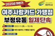 (누리일보) 여주시는 지역화폐인 여주사랑카드의 부정유통 근절을 위해 지난 11월 26일부터 오는 12월 10일까지 집중 단속에 나선다고 밝혔다. 주요 단속 대상은 ▲ 물품의 판매 또는 용역의 제공 없이 지역화폐를 수취·환전하는 행위 ▲ 실제 매출금액 이상의 거래를 통하여 지역화폐를 수취·환전하는 행위 ▲ 가맹점이 등록 제한업종을 영위하는 경우 ▲결제를 거부하거나 다른 결제 수단에 비해 불리하게 대우하는 행위 ▲기타 단속이 필요성이 있다고 인정되는 경우 등이다. 이번 일제 단속은 가맹점 데이터 목록을 참고 및 주민 신고 등을 토대로 의심되는 현장을 방문해 확인하는 방식으로 진행된다. 여주시 일자리경제과 관계자는 “지역화폐 제도의 지속가능성, 신뢰성을 확보하고 지역 자금의 역외유출 방지를 위해서는 여주사랑카드 사용자와 가맹점주 모두 함께 힘을 합쳐야 건전한 유통 문화를 만들어갈 수 있다”협조를 당부했다. 부정유통 적발 시 여주사랑카드 가맹점 등록취소, 관계 법령에 따라 최대 2,000만원 이하의 과태료가 부과될 수 있으며, 위반행위 조사를 거부·방해 또는 기피하는 경우에도 최대 500만원 이하의 과태료