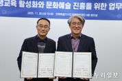 (누리일보) 전북특별자치도평생교육장학진흥원과 전북특별자치도문화관광재단은 11월 26일, 전북문화관광재단 회의실에서 평생학습과 문화예술 분야의 공동 발전을 목표로 업무협약(MOU)을 체결했다. 본 협약은 양 기관이 상호 협력체계를 구축하여 평생학습사회 구현과 문화예술 진흥, 나아가 문화복지의 확산을 함께 도모함으로써 전북도민의 삶의 질을 높이고 지역의 지속 가능한 학습생태계를 조성하는 데 그 목적이 있다. 주요 협약 내용으로는 ▲문화예술 기반 평생학습 프로그램 공동 개발 및 운영 ▲인적·물적 자원의 상호 활용 및 협력 사업 발굴 ▲세미나·포럼 등 공동 연구 및 정책 협력 등이다. 이현웅 전북특별자치도평생교육장학진흥원장은 “이번 업무협약은 도민의 삶 속에서 평생교육과 문화예술이 자연스럽게 연결되는 기반을 마련하는 중요한 발걸음”이라며, “도 출연기관 간 협력을 통해 시너지 효과를 극대화하고, 도민 모두가 누릴 수 있는 학습·문화 환경 확대에 최선을 다하겠다”고 밝혔다. 양 기관은 협약 체결 이후 세부 추진방안을 논의하기 위한 협력 체계를 마련하고, 다양한 함께 추진할 수 있는 다양한 사업을 지속적으로