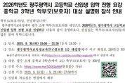 (누리일보) 광주시교육청은 오는 30일 오후 7시 광주시교육청교육연구정보원 대강당에서 중학교 3학년 학생과 학부모를 대상으로 ‘고입 전형요강 설명회’를 개최한다. 이번 설명회는 고등학교 입학을 앞둔 학생·학부모의 궁금증을 해소하고, 진로·진학 선택에 도움을 주기 위해 마련됐다. 설명회에서는 ▲자율형공립고 ▲과학중점학교 ▲전기고(마이스터고・특성화고・특목고・예술고·체육고 등) ▲후기 일반고 전형요강 등을 안내하고 질의응답을 진행한다. 설명회 참여 신청은 오는 23일까지 온라인'으로 하면 된다. 현장 접수도 가능하며, 행사에 참석하지 못하는 학부모를 위해 시교육청 유튜브 채널을 통해 실시간 중계할 예정이다. 올해 고등학교 원서 접수는 ▲10월 20일 산업수요맞춤형고(마이스터고) 및 광주형마이스터고 ▲10월 21일 광주예술고 ▲11월 3일 광주체육고 ▲11월 24일 특성화고 ▲12월 16일 자율형공립고, 과학중점고를 포함한 평준화 일반고 등 순으로 시작된다. 평준화 일반고 합격자 발표는 2026년 1월 8일이며, 배정 발표는 1월 22일 이뤄진다. 또 학교장이 직접 학생을 선발하는