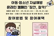 (누리일보) 시흥시자살예방센터는 오는 10월 1일부터 31일까지 한 달간 아동ㆍ청소년을 대상으로 생명존중 인식 확산 캠페인을 운영한다. 이번 캠페인은 아동ㆍ청소년이 심리적 지지를 얻고 생명의 소중함을 되새기도록 돕는 한편, 이를 누리소통망(SNS)을 통해 또래와 나눌 수 있도록 마련됐다. 캠페인 참여 방법은 시흥시 관내 교육기관, 행정복지센터, 아동ㆍ청소년 관련 기관 등에 부착된 자살 예방 홍보 스티커를 촬영한 후, 개인 누리소통망(인스타그램)에 스토리 또는 게시물 형태로 올리면 된다. 이후 해당 게시물을 캡처해 정보무늬(큐알코드)를 통해 연결된 네이버 폼에 제출하면 참여가 완료된다. 이기연 시흥시자살예방센터장은 “이번 캠페인이 아동ㆍ청소년들이 온라인 공간에서 자신과 친구들의 소중함을 되돌아보는 계기가 되길 바란다”라며 “많은 청소년이 적극적으로 동참해 건강한 생명존중 문화가 확산하길 기대한다”라고 말했다.