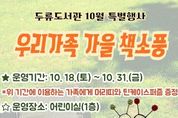 (누리일보) 대구두류도서관은 10월 18일부터 31일까지 어린이실에서 선착순 40가족을 대상으로 책과 소풍 물품을 함께 대여하면 머리띠와 퍼즐을 증정하는‘우리가족 가을 책소풍’행사를 실시한다. 참여를 원하는 가족은 어린이실에 방문하여 도서관 회원증을 제시하고 책과 돗자리, 간이의자, 미니테이블, 독후활동지, 보드게임 등 소풍에 필요한 물품을 대여하고 당일 오후 5시까지 반납하면 된다. 기타 자세한 내용은 도서관 누리집 또는 어린이실로 문의하면 된다.