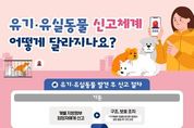 (누리일보) 유기·유실동물 신고체계 어떻게 달라지나요? ■ 유기·유실동물 발견 후 신고 절차 (기존) 개별 지방정부 담당자에게 신고 → 구조, 보호 조치 *지역별로 동물보호센터 등에서 현장 출동 후 구조·보호 (개선) 방법 ① 개별 지방정부 담당자에게 신고 → 구조, 보호 조치 *지역별로 동물보호센터 등에서 현장 출동 후 구조·보호 방법 ② 동물보호상담센터 ☎1577-0954(1) → 관할 지방정부 전화 자동 연결 → 구조, 보호 조치 *지역별로 동물보호센터 등에서 현장 출동 후 구조·보호 방법 ③ 국가동물보호정보시스템 접수 → 접수 내용 관할 지방정부 전달 → 구조, 보호 조치 *지역별로 동물보호센터 등에서 현장 출동 후 구조·보호