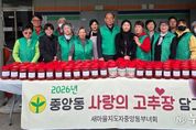 (누리일보) 오산시 중앙동은 지난 30일 새마을지도자 중앙동 부녀회가 지역 내 어려운 이웃을 위해 직접 담근 고추장 90통을 전달했다고 밝혔다. 이번 나눔은 새마을부녀회 회원들이 재료 준비부터 담그기까지 전 과정에 직접 참여해 정성을 더했으며, 관내 저소득층 가구에 전달되어 식생활 지원은 물론 이웃의 따뜻한 관심과 온기를 함께 전하는 계기가 될 것으로 기대된다. 중앙동 새마을부녀회는 매년 고추장과 삼계탕 등 다양한 먹거리 나눔 활동을 통해 이웃사랑을 실천하며 지역사회에 따뜻한 변화를 만들어가고 있다. 심옥자 중앙동 새마을부녀회장은 “회원들의 정성과 마음을 모아 준비한 만큼 이웃들에게 작은 힘이 되길 바란다”며 “앞으로도 지속적인 나눔 활동을 이어가겠다”고 말했다. 백경희 중앙동장은 “항상 이웃을 먼저 생각하며 실천해 주시는 새마을부녀회에 깊이 감사드린다”며 “소중한 나눔이 꼭 필요한 곳에 전달될 수 있도록 최선을 다하겠다”고 밝혔다.
