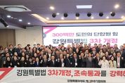 (누리일보) 강원특별자치도 범국민추진협의회(협의회장 최양희, 추진단장 김천수)가 11월 21일 11시, 춘천 스카이컨벤션 2층 컨벤션홀에서 강원특별법 3차개정 조속 통과 촉구 결의대회를 개최했다. 당초 정기총회를 개최할 예정이었으나 어제(11월 20일) 국회 행정안전위원회 법안소위에서 강원특별법 3차 개정이 논의가 불발되자 긴급 행동에 나섰다. 이날 결의대회에는 범추협 위원들을 비롯해 고문직을 맡고 있는 김진태 도지사, 김시성 도의회 의장 등 200여 명이 참석하여 조속 통과를 촉구하는 목소리를 높였다. 최양희 협의회장은 “오늘은 강원특별자치도의 성과를 함께 축하하는 날이 돼야 했지만, 어제 행안위에서 3차 개정을 또 미루는 바람에 오히려 우리의 결의를 더 크게 보여줘야 하는 날이 됐다”라며, “각 지역에서 올라오신 위원 여러분의 지혜와 네트워크가 어느 때보다 절실하다”라고 말했다. 김진태 강원특별자치도지사는 “3차 개정안이 처음 국회에 올라간 게 작년 9월인데, 1년이 넘도록 단 한 번도 심사를 하지 않았다”라며, “5극 3특을 강조하면서 특별자치도 법은 시간이 없다고 국회 심사가 미뤄지는 것이 현실이다