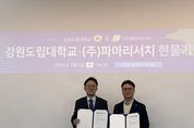 (누리일보) 강원도립대학교와 재생의학 기반 바이오 제약 기업인 ㈜파마리서치(대표이사 손지훈)가 지역 혁신 성장을 주도할 전문 인재 양성을 위해 손을 잡았다. 강원도립대학교는 2월 4일 대학 본부에서 파마리서치와 ‘산학협력 업무협약 및 현물 기탁식’을 개최했다고 밝혔다. 이번 행사는 양 기관이 앞서 서면으로 체결한 산학협력 협약의 내용을 공유하고, 파마리서치 측에서 기탁한 현물을 전달하기 위해 마련됐다. 양 기관은 이번 협약을 통해 대학과 기업이 보유한 역량을 결합해 지역 맞춤형 인재 양성을 위한 현장 밀착형 교육 생태계를 구축하기로 뜻을 모았으며, 영동지역 청년 인재 채용 활성화 및 실무형 전문 인력 양성, 객관적 취업 정보 공유, 산학 공동발전을 위한 구체적인 협력 사업을 함께 펼칠 예정이다. 특히 파마리서치는 이번 MOU 체결을 기념해 학생과 교직원에게 1천만원 상당의 자사 대표 제품을 기탁하며 학생들의 건강한 도전과 성장을 응원했다. 강원도립대학교 최종균 총장은 “글로벌 바이오 기업인 파마리서치의 소중한 기탁과 협력 약속에 깊은 감사를 드린다”며 “대학 또한 기업이 필요로 하는