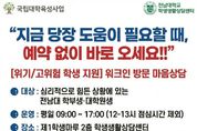 (누리일보) 전남대학교가 심리적 위기 상황에 놓인 학생을 ‘그 순간’ 바로 지원하는 즉시 개입형 상담체계를 구축했다. 예약과 대기를 없애고 방문 즉시 전문가와 연결하는 ‘워크인(Walk-in) 심리상담’을 도입해, 위기 대응의 골든타임을 확보하고 고위기·고위험군 학생 보호를 한층 강화한다. 1일 전남대에 따르면, 학생생활상담센터는 심리적 위기를 경험하는 학생들을 신속하게 지원하기 위해 ‘워크인(Walk-in) 심리상담’ 제도를 도입하고 본격 운영에 들어갔다. ‘워크인 심리상담’은 별도의 사전 예약 없이 센터를 방문하면 즉시 상담 전문가와 연결되는 밀착형 지원 시스템이다. 특히 심리적 긴급 상황이나 고위험군에 속한 학생들이 초기 개입 시점을 놓치지 않고 전문적인 상담을 받을 수 있도록 설계됐다. 이번 제도는 학생들이 도움을 요청하는 ‘바로 그 순간’에 개입하는 것을 핵심으로, 기존 예약 중심 상담 체계의 한계를 보완하고 보다 신속하고 실효성 있는 위기 대응을 가능하게 할 것으로 기대된다. 정주리 학생생활상담센터장은 “학생들이 마음의 문을 열고 도움을 요청하는 그 순간에 필요