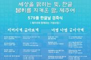 (누리일보) 제주특별자치도는 훈민정음 반포 579돌 한글날을 맞이해 오는 9일 오전 10시 제주문예회관에서 한글날 경축식을 개최한다. 이번 경축식은‘세상을 밝히는 빛, 한글/불휘를 지켜온 말, 제주어’를 주제로 열린다. 한글이 세상을 밝히는 빛처럼 백성들의 어려움을 덜어주었듯 제주어는‘불휘’(뿌리의 옛말)라는 표현처럼 우리말의 소중한 뿌리를 간직해온 언어유산이라는 의미를 담고 있다. 제주도는 한글의 창제 정신을 기리는 동시에 소멸 위기에 처한 제주어의 가치를 알리고 보존하기 위해 다양한 프로그램으로 경축식을 준비했다. 올해 행사는 당초 설문대여성문화센터에서 개최되던 것을 제주문예회관 대극장으로 옮겨 한글 및 제주어 관련 단체, 학생 등 더 많은 도민이 함께해 한글과 제주어의 가치를 더욱 널리 알릴 수 있게 됐다. 특히 올해는 표준어와 제주어를 함께 사용하는 남녀 사회자의 진행으로 두 언어의 조화로운 공존을 보여줄 계획이다. 경축식은 제주어교육 시범학교인 신제주초등학교 ‘지꺼진 코플레기 합창단’의 제주어 뮤지컬 공연으로 시작된다. 어린이들이 들려주는 제주 바다 이야기는 제주