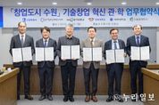 (누리일보) 수원특례시가 경기창조경제혁신센터, 4개 대학과 협력해 대학의 기술창업을 발굴하고, 지원한다. 수원시와 경기창조경제혁신센터, 4개 대학은 30일 시청 상황실에서 ‘창업도시 수원 기술창업 혁신 관·학 업무협약’을 체결하고, 협력을 약속했다. 협약 기관들은 대학의 우수한 연구 성과, 인적 자원을 보유한 우수 기술창업기업을 발굴하고, 기술의 사업화를 촉진하기 위해 협력하기로 했다. 수원시는 수원기업새빛펀드의 수원기업 의무투자 약정액으로 투자를 유치하고, 경기창조경제혁신센터는 기업에 멘토링, 엑셀러레이팅(스타트업이 빠르게 성장하도록 지원), 밋업(투자자 유치 행사), 아이알(IR)데이, 투자 등을 지원한다. 대학교는 실험실 창업·창업 보육기업을 추천한다. 이날 협약을 바탕으로 대학창업 특화 프로그램인 ‘새빛 유-테크(U-Tech).판’을 시작한다. 경기창조경제혁신센터의 엑셀러레이팅 인프라를 활용해 우수한 기술력과 성장 잠재력을 갖춘 창업기업을 발굴하고, 기업의 투자 유치 역량을 극대화하는 프로그램이다. 3대 핵심 목표는 ‘인프라 적극 활용’, ‘선순환 구조 구축’, ‘실질적 투자 집행’이다. &