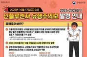 (누리일보) 광명시는 최근 인플루엔자 환자가 빠르게 증가함에 따라 시민들에게 예방접종과 개인예방수칙 준수를 재차 당부했다. 28일 시에 따르면 올해 44주차(10월 26일~11월 1일)부터 47주차(11월 16~21일) 인플루엔자 의사환자 분율(인플루엔자 의사환자 수/총 진료 환자 수)은 외래환자 1천 명당 ▲22.8명 ▲50.7명 ▲66.3명 ▲70.9명으로 4주 연속 크게 상승했다. 올해 유행 시기가 예년보다 앞당겨지면서 지난 10월 17일 인플루엔자 유행주의보 발령 이후 감염 위험이 빠르게 높아지고 있다. 시는 특히 ▲소아 ▲임신부 ▲65세 이상 어르신 ▲면역저하자 등 고위험군은 가까운 위탁의료기관에서 신속히 접종을 받을 것을 권고했다. 또한 감염 확산을 줄이기 위해서는 손 씻기와 마스크 착용 등 기본적인 예방수칙을 지키고, 발열·기침 등 의심 증상이 있을 경우 즉시 의료기관을 방문해 진료받는 것이 바람직하다. 박선미 감염병관리과장은 “올해 인플루엔자 유행이 평년보다 빨라 주의가 더욱 필요한 시기”라며 “특히 고위험군은 서둘러 예방접종을 받고, 개인위생 수칙을 철저히 지켜달라”고