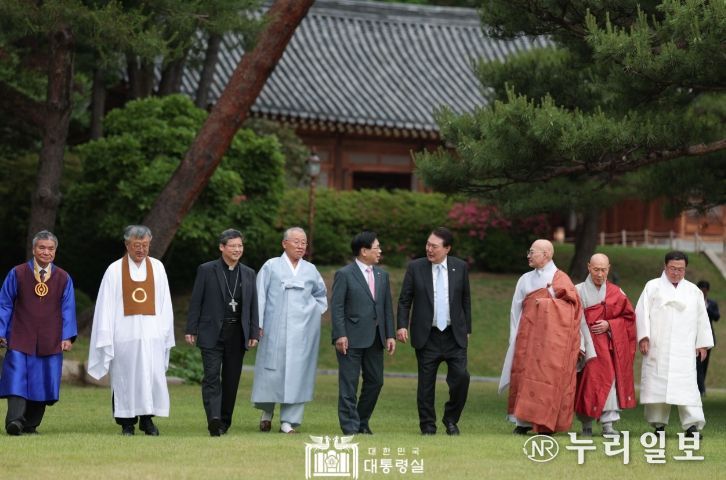 (누리일보) 윤석열 대통령은 5. 30일 낮 청와대 상춘재에서 조계종 진우 총무원장과 천태종 덕수 총무원장 그리고 이영훈 한국교회총연합대표회장, 김삼환 명성교회 원로목사, 정순택 천주교 서울대 교구장, 나상호 원불교 교정원장 그리고 최종수 성균관장과 박상종 천도교 교령, 김령하 한국민족종교협의회회장 등 종교 지도자와 오찬을 하면서 취임 이후 지난 1년간의 국정 전반에 대해 설명을 드렸다.
