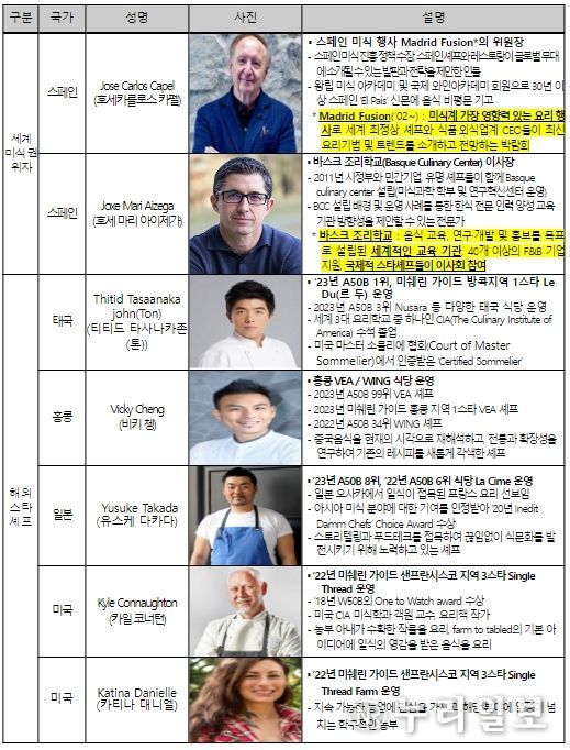 이번 토론회(컨퍼런스)에는 미식계 가장 영향력 있는 요리행사 중 하나인 마드리드 퓨전*(Madrid Fusion) 설립자이자 위원장인 호세 카를로스 카펠(Jose Carlos Capel), 세계적 요리 교육기관인 스페인 바스크 조리학교* (Basque Culinary Center)의 이사장 호세 마리 아이제가*(Joxe Mari Aizega), 미국에서 높은 권위를 인정받는 음식재단 제임스 비어드 파운데이션* 전 최고전략책임자(前 CSO, Chief Strategy Officer) 미첼 데이비스(Mitchell Davis) 및 해외 유명 요리사(이하 셰프)들이 참여한다.