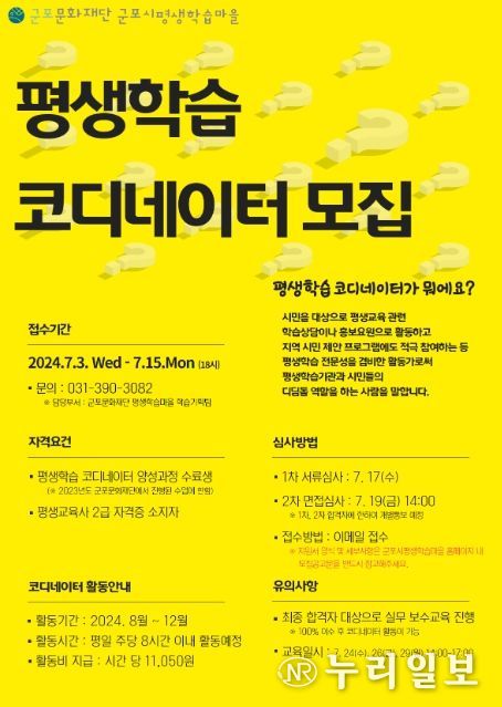 (누리일보) 군포문화재단 군포시평생학습마을에서 2024년‘평생학습 코디네이터’를 모집한다.‘평생학습 코디네이터’는 평생학습 전문성을 겸비한 활동가로써 시민을 대상으로 학습상담이나 홍보요원으로 활동하고 지역시민 제안 프로그램에도 적극 참여하는 등 평생학습기관과 시민들의 디딤돌 역할을 하게 된다.