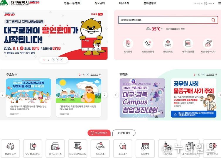 (누리일보) 대구광역시는 8월 15일 오후 2시부터 16일 오후 2시까지 약 24시간 동안 ‘통합전산센터 전기시설 개선 작업’에 따라 시 대표 홈페이지를 비롯한 대민·행정 서비스 165종이 일시 중단된다고 밝혔다.