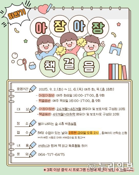 (누리일보) 제주도교육청 제주도서관은 9월 2일부터 오는 11월 6일까지 별이 내리는 숲 4층 박종실홀에서 가족이 함께 책을 읽는 습관 조성으로 지역 독서 문화를 확산시키고자 ‘2025년 하반기 아장아장 책걸음’을 운영한다.