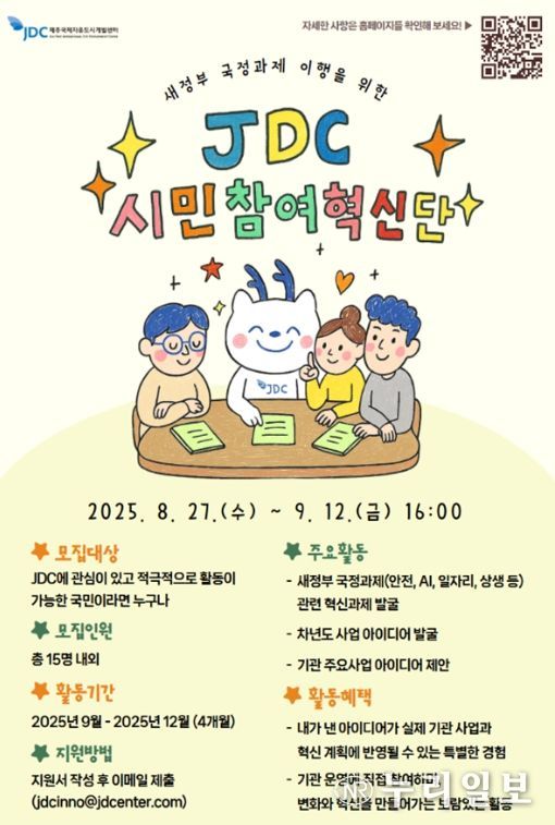 (누리일보) 제주국제자유도시개발센터는 시민 참여 확대를 위해 8월 27일부터 9월 12일까지 '새정부 국정과제 이행을 위한 2025년 JDC 시민참여혁신단'을 모집한다고 25일 밝혔다.