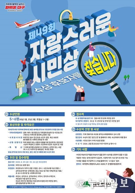 (누리일보) 대구광역시는 지역사회 발전을 위해 헌신하고 선행과 효행으로 타의 모범이 되는 시민을 발굴해 시상하기 위해 8월 29일부터 10월 24일까지 ‘제49회 자랑스러운 시민상’ 후보자를 공개 모집한다.