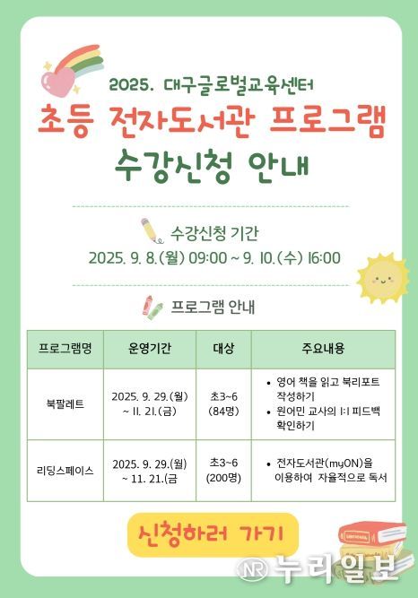 (누리일보) 대구교육연수원 산하 대구글로벌교육센터는 9월 29일부터 11월 21일까지 초등학교 3~6학년 학생 284명을 대상으로 영어 문해력 향상과 자기주도적인 독서 습관 형성을 위해 전자도서관을 활용한‘초등 온라인 영어 독서 프로그램’을 운영한다.