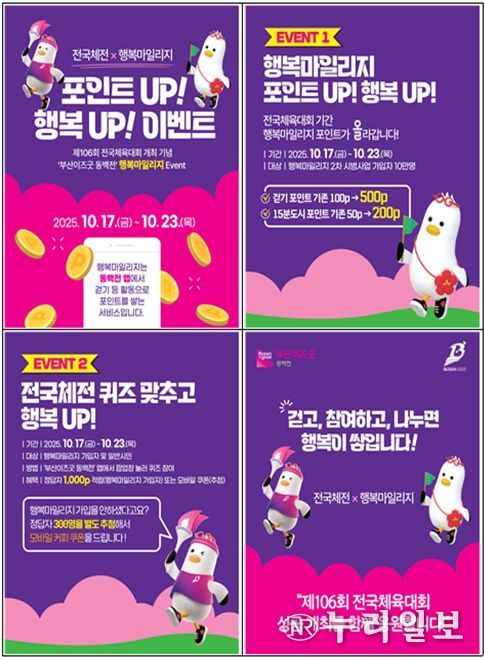 (누리일보) 부산시는 제106회 전국체육대회 개최를 기념하여 부산이즈굿 동백전 '행복마일리지' 특별 이벤트인 '포인트 업(UP)! 행복 업(UP)!'을 오는 10월 17일부터 23일까지 7일간 추진한다고 밝혔다.