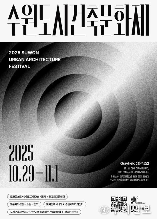 (누리일보) 수원특례시는 10월 29일부터 11월 1일까지 정조테마공연장, 수원시미디어센터, 팔달문화센터 등에서 ‘2025 수원도시건축문화제’를 연다.