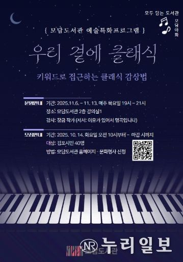 (누리일보) 김포시 모담도서관은 클래식을 주제로 11월 6일부터 13일까지 매주 목요일 오후 7시부터 9시까지 특별 강연을 운영한다.