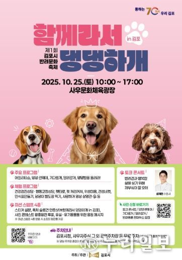 (누리일보) 김포시는 반려동물과 시민이 함께하는 문화의 장인 제1회 김포시 반려문화축제 '함께라서 댕댕하개 in 김포'가 오는 10월 25일 사우문화체육광장(사우동)에서 개최된다고 밝혔다.