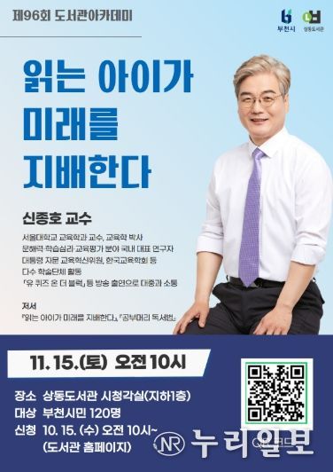 (누리일보) 부천시는 11월 15일 오전 10시 부천시립상동도서관 시청각실에서 인공지능(AI)·디지털 시대 학습 경쟁력의 핵심인 문해력을 주제로 ‘제96회 도서관 아카데미’를 연다. 이번 강연은 ‘읽는 아이가 미래를 지배한다’의 저자이자 서울대학교 교육학과 교수인 신종호 교수를 초청해 진행한다.