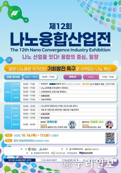 (누리일보) 경상남도는 오는 16일부터 17일까지 이틀간 밀양햇살문화캠퍼스에서 ‘나노산업을 잇다! 융합의 중심, 밀양’을 주제로 제12회 나노융합산업전(나노피아 2025)을 개최한다고 밝혔다.