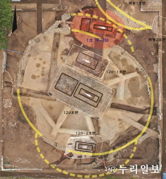 (누리일보) 국가유산청은 경주시와 신라왕경 핵심유적 복원정비사업의 일환으로 추진하고 있는 경주 황남동 120호분 적석목곽분(돌무지 덧널무덤) 밑에서 적석목곽분 이전 시기에 먼저 조성됐던 목곽묘(덧널무덤, 경주 황남동 1호 목곽묘)를 새롭게 확인하고, 그 안에서 사람과 말의 갑옷과 투구 일체, 금동관 일부, 무덤 주인으로 추정되는 남성 장수 인골과 순장된 시종 추정 인골 등을 발굴했다.