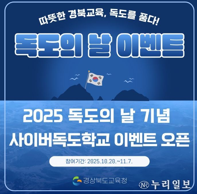 (누리일보) 경북교육청은 독도의 날(10월 25일)을 맞아 20일부터 다음 달 7일까지 3주간, 전 국민이 참여할 수 있는 ‘2025 독도의 날 기념 독도사랑 온라인 축제’를 운영한다고 밝혔다.