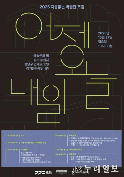 (누리일보) 경기도와 경기문화재단은 일상 곳곳의 발자취를 ‘박물관’으로 만드는 지붕없는 박물관(경기에코뮤지엄)사업의 '2025 지붕없는 박물관 포럼_어제·오늘·내일'을 10월 27일 오후 1시 30분 경기문화재단 예술인의 집(수원)에서 개최한다.