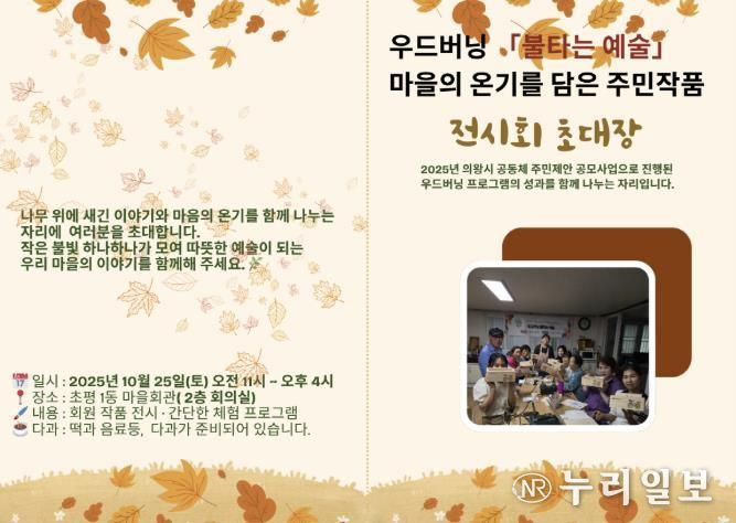 (누리일보) 의왕시는 마을공동체 자강불식이 오는 10월 25일 초평1동마을회관(윗새우대북길 14)에서'우드버닝, 불타는 예술'작품전시회를 개최한다고 밝혔다.