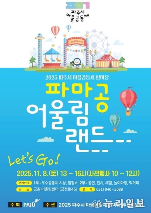 (누리일보) 파주시는 한 해 동안의 마을공동체 활동과 성과를 공유하고, 공동체 활동의 사회적 가치와 인식을 확산하기 위해 오는 11월 8일 금촌어울림센터에서 '2025 파주시 마을공동체 한마당 ‘파마공 어울림랜드’'(이하 ‘한마당’)를 개최한다.