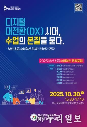 (누리일보) 부산광역시교육청은 오는 30일 오후 부산교육대학교 참빛극장에서 초등 교원과 교육전문직원 등 200여 명을 대상으로 ‘디지털 대전환(DX)* 시대, 수업의 본질을 묻다’를 슬로건으로 ‘2025 부산 초등 수업혁신 정책포럼’을 개최한다고 밝혔다.