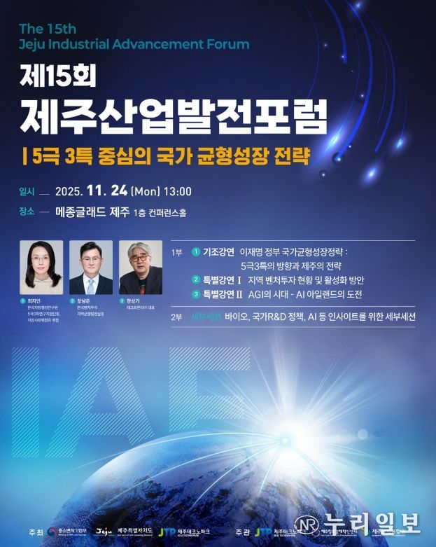 (누리일보) 제주테크노파크(원장 지영흔, 제주TP)는 오는 24일 메종글래드 제주 1층 컨퍼런스홀에서 ‘5극 3특 중심의 국가 균형성장 전략’을 주제로 제15회 제주산업발전포럼을 개최한다.