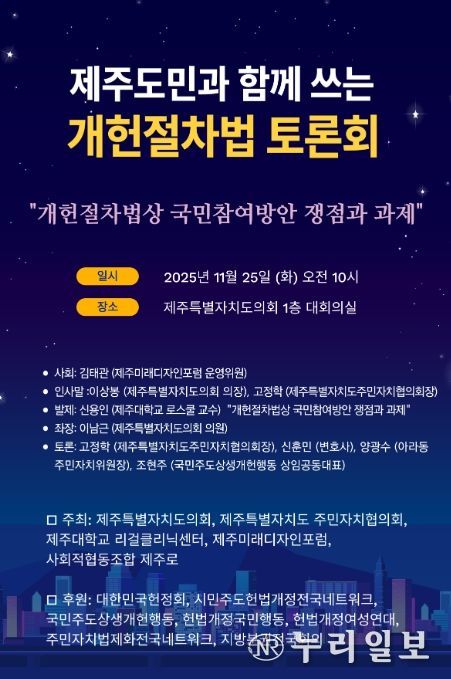(누리일보) 제주특별자치도의회, 제주특별자치도 주민자치위원회협의회, 제주대학교 리걸클리닉센터, 제주미래디자인포럼, 사회적협동조합 제주로 공동 주최로 11월 25일 오전 10시, 제주특별자치도의회 1층 대회의실에서 '제주도민과 함께 쓰는 개헌절차법 토론회'를 개최한다.