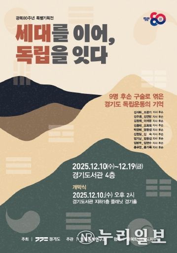 (누리일보) 경기도가 광복 80주년을 맞아 10일부터 19일까지 경기도서관 4층에서 독립운동가와 그 후손들의 삶을 통해 독립정신을 되새기는 사료전시회 ‘세대를 이어, 독립을 잇다’를 연다.