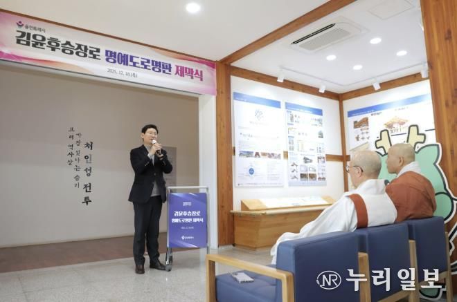 (누리일보) 용인특례시는 18일 처인구 남사읍에 있는 처인성역사교육관에서 ‘김윤후승장로’ 명예도로명판 제막식을 열었다.