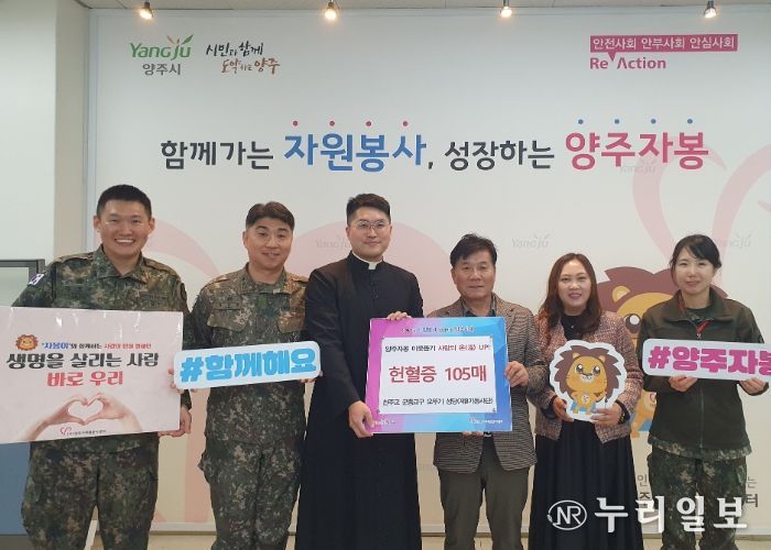 (누리일보) 양주시자원봉사센터는 천주교 군종교구 오뚜기 성당(제8기동사단) 오형훈 군종신부와 군 장병들이 연말을 맞아 헌혈증 105장을 기부했다고 밝혔다.