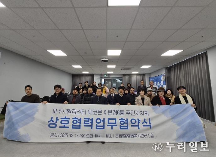 (누리일보) 운정6동 주민자치회는 12월 17일 오전 10시, 운정6동 행정복지센터에서 파주시환경센터 ‘에코온’과 ‘지역 환경 의제 실천 및 기후행동 협력을 위한 업무협약’을 체결하고, 이어 마을 소식지 '초롱꽃향기로' 2호 제작 성과공유회를 개최했다.