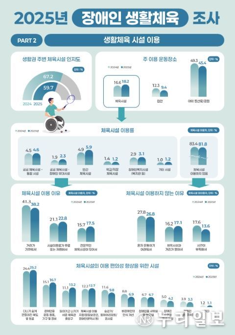 (누리일보) 문화체육관광부는 대한장애인체육회와 함께 전국 등록 장애인 1만 명(만 10세~69세)을 대상으로 진행한 ‘2025년 장애인 생활체육조사(2024년 9월~2025년 8월 기준)’ 결과를 발표했다.