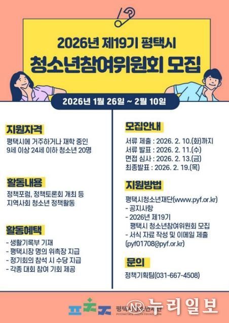 (누리일보) 평택시와 평택시청소년재단은 청소년 정책 참여 기회를 확대하고 자치 역량을 강화하기 위한 2026년 제19기 청소년참여위원회 위원 20명을 공개 모집한다고 밝혔다.