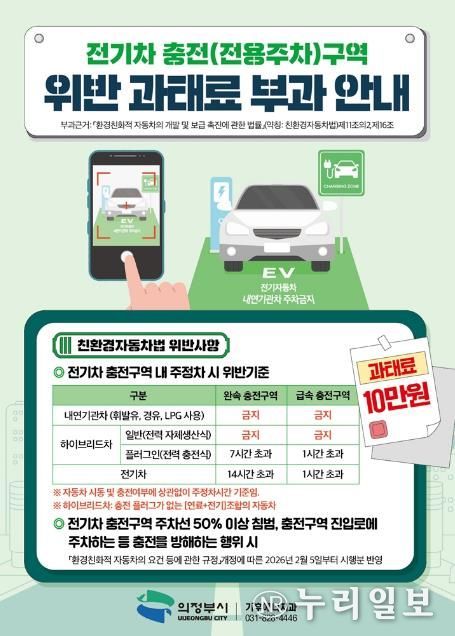 (누리일보) 의정부시는 환경친화적 자동차 전용주차(충전)구역에 대해 주정차 위반 단속을 시행하고 있다고 29일 밝혔다.